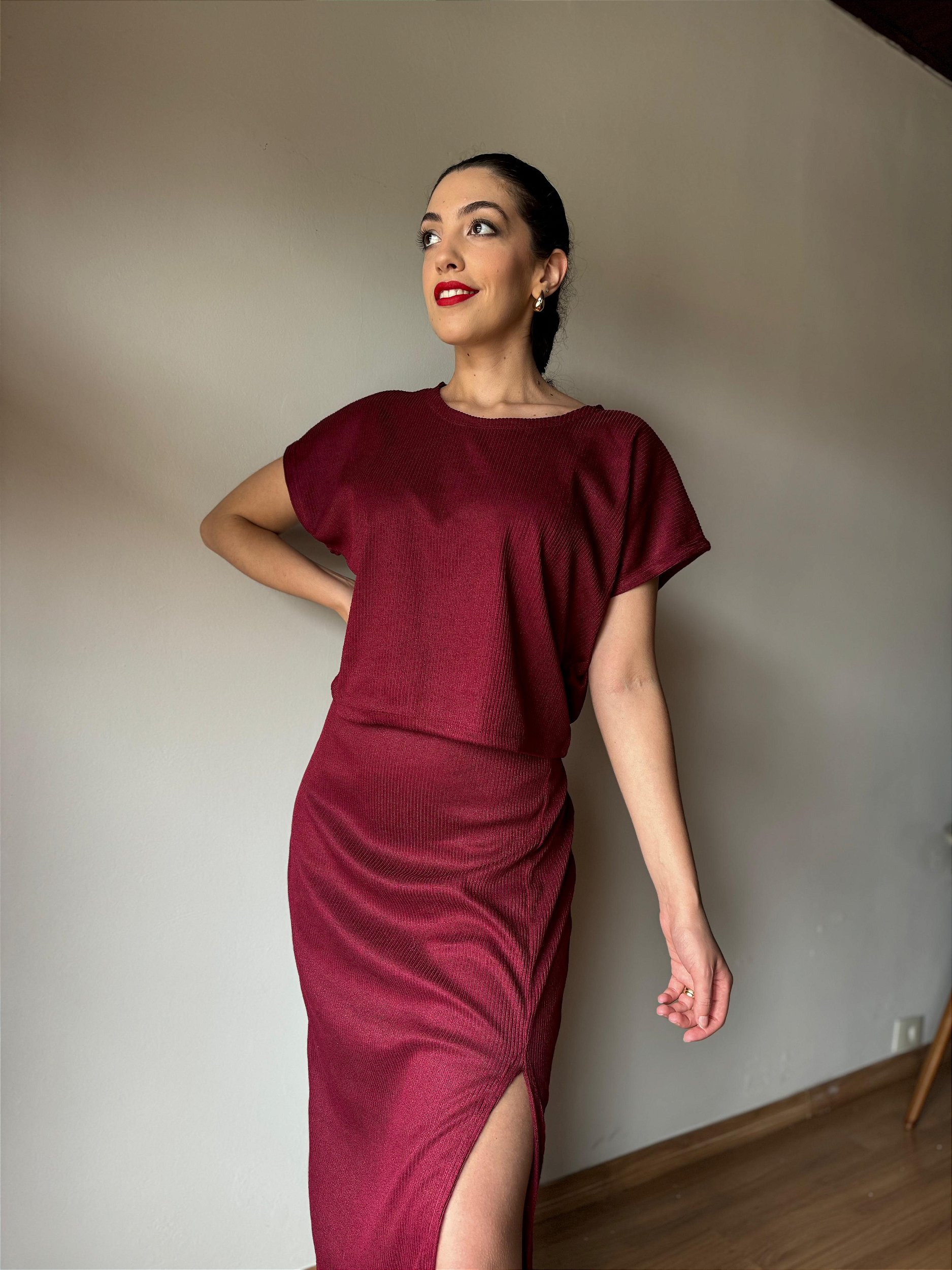 Composto por uma blusa e saia, esse conjunto é confeccionado em malha de alta qualidade, com excelente estrutura e elasticidade, proporcionando um ajuste perfeito ao corpo, valorizando a silhueta de forma sutil e elegante.